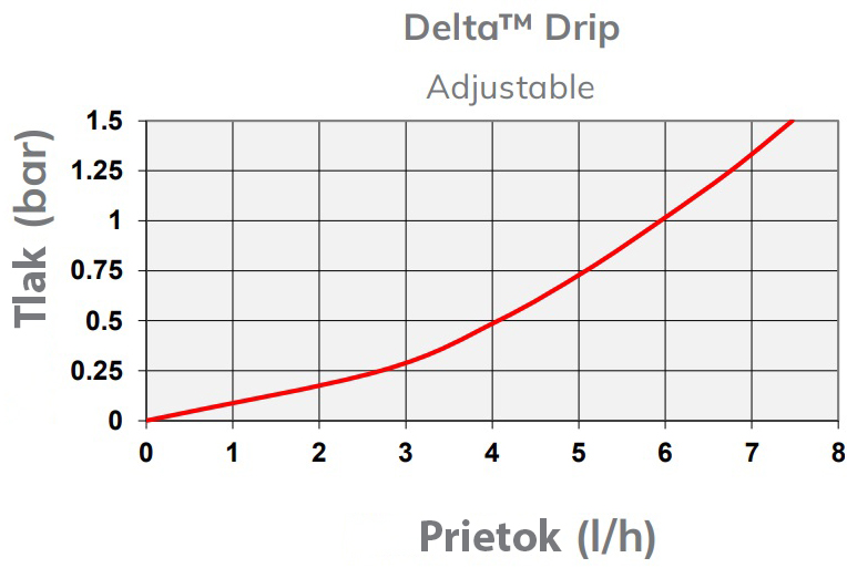 Delta Drip je nastaviteľný kvapkovač s telom vo forme zapichovacieho hrotu, určený pre cielené zavlažovanie rastlín. Otáčaním integrovaného kľúča je možné plynule regulovať prietok vody v rozsahu od 0 až do 6 litrov za hodinu (pri tlaku 1.0 bar), vrátane možnosti úplného uzavretia. Kvapkovač je vyrobený z UV stabilizovaného materiálu, čo zaručuje jeho dlhú životnosť.