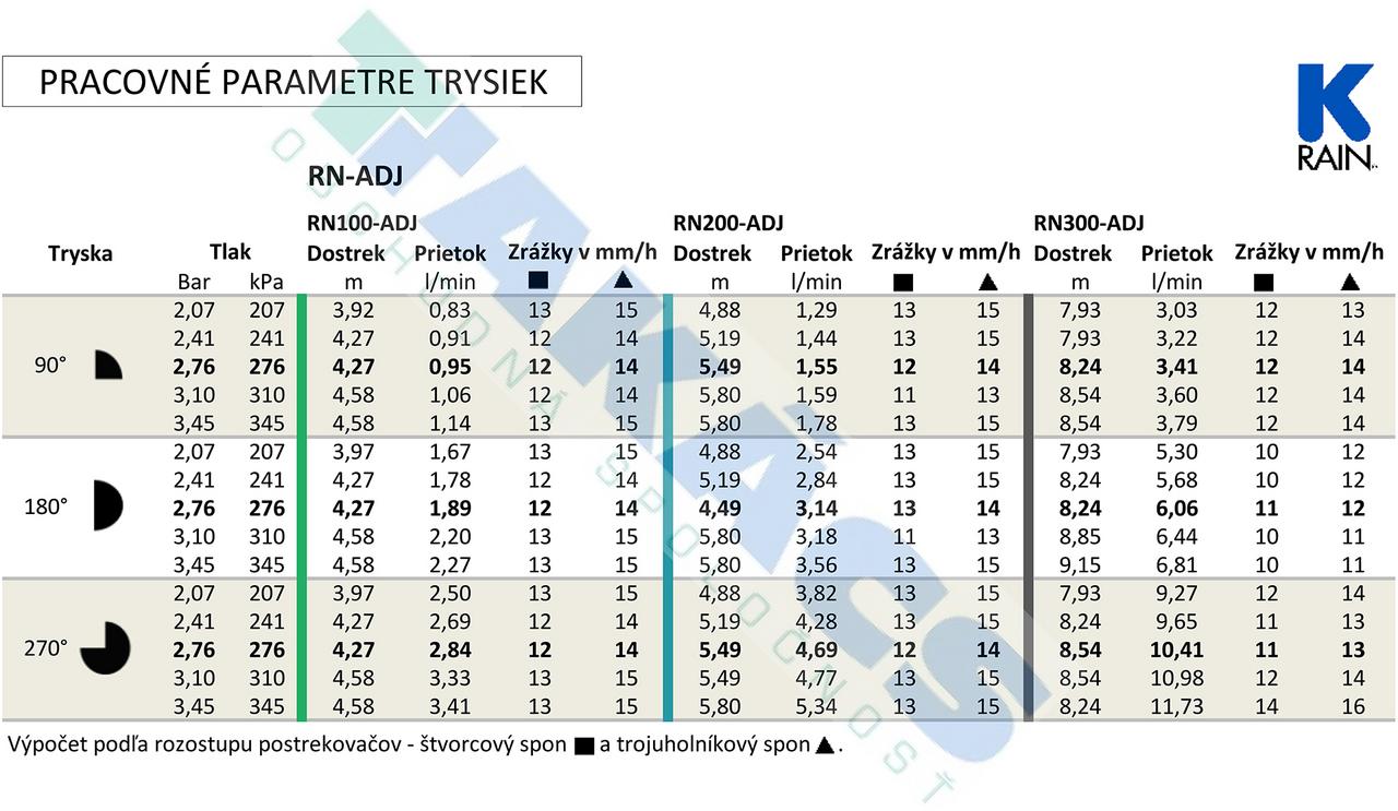 Modrá rotačná tryska K-Rain RN200-ADJ-90-270 s vnútorným závitom a plne nastaviteľným uhlom 90° – 270°. Má dostrek 4,87 m – 5,79 m a prevádzkovú spotrebu vody 1,29 l/min – 5,34 l/min pri tlaku 2,07 až 3,45 bar. Je kompatibilná s telesami sprejových postrekovačov s vonkajším závitom.