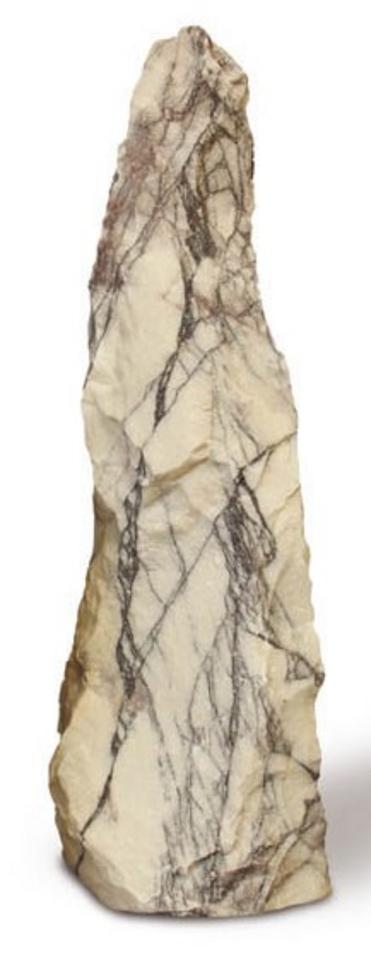 Impozantný solitérny stĺp (monolit) Leilac, prevŕtaný pre inštaláciu vodného prvku, s bielou bázou a výrazným fialovým žilkovaním pre chladnú eleganciu.